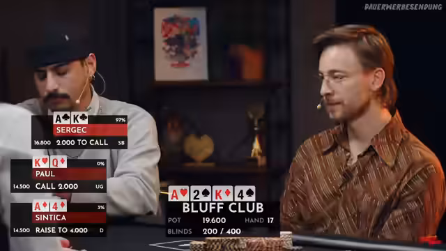 01:14:20Das Turnier schreitet voran, und die Teilnehmerzahlen schrumpfen. Syndika gerät mit wenigen Chips unter 10 Big Blinds in Bedrängnis und muss bald all-in gehen. Lara festigt ihre Führung als 'Titelverteidigerin'. Paul wird aus dem Turnier eliminiert, nachdem er mit einer Dame auf dem Board gegen Laras verborgenen Drilling (Zweier) verliert. Auch Serjak scheidet aus, nachdem seine Buben-Paarung gegen die Damen-Paarung von Lara unterliegt. Die Blinds werden auf 400/800 erhöht, was den Druck auf die verbleibenden Spieler erhöht.
