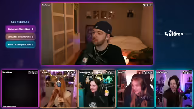 01:09:30Nachdem alle Teammitglieder die drei Spielmodi – Erklären, Zeichnen und Pantomime – durchlaufen haben, folgt eine Pause. In dieser Zeit wechseln die Teams neu, um für die zweite Runde frische Konstellationen zu schaffen. Die neuen Teams sind Tim Horus, Lara Loft und KaddiTV gegen Starlet Nova, Lilly the Chili und Smash Lunatic. Die Stimmung ist gelöst und teamorientiert, die Streamerinnen und Streamer ermutigen sich gegenseitig und beraten sich über schwierige Begriffe. Dieser Teamgeist ist ein wesentlicher Bestandteil des gemeinsamen Erlebnisses.
