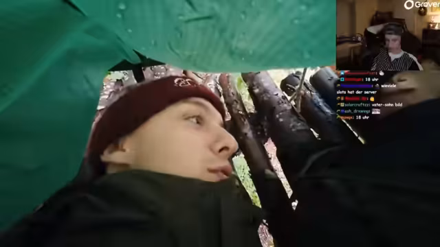 01:09:55Der Aufbau eines Regenschutzes gestaltet sich schwierig, da die Akteure durch eine Kette miteinander verbunden sind und sich gegenseitig behindern. Es wird versucht, das Tarp schräg zu spannen, damit das Regenwasser bei den aktuell herrschenden neun Grad Celsius und Dauerregen besser abfließen kann. Die Koordination der Arbeitsschritte ist mühsam, da oft nur eine Person aktiv arbeiten kann, während die andere warten muss. Trotz der fehlenden Erfahrung im Bushcraft-Bereich sind die Beteiligten mit dem vorläufigen Ergebnis der Konstruktion zufrieden.
