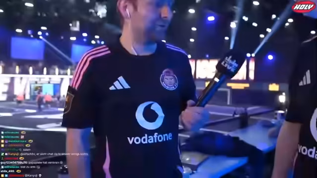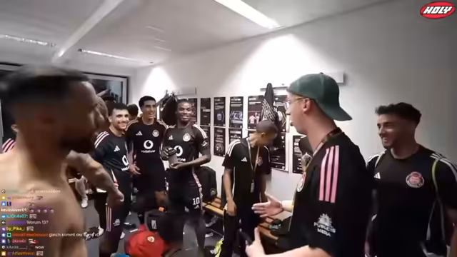 00:21:07Nach dem Erhalt eines Bändchens gelingt es dem Streamer, den Zuschauerbereich zu erreichen und live vom Spiel zu berichten. Er nutzt die Trommel seines Teams, um die Fans anzufeuern, und interagiert mit anderen Zuschauern. Es kommt zu kurzen Begegnungen mit bekannten Persönlichkeiten wie Adam und dem Team um Kevin, wobei immer wieder technische Probleme wie Verbindungsabbrüche auftreten.