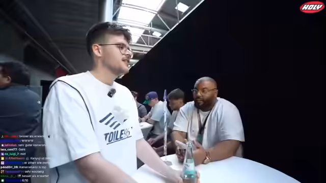 01:12:06Auf seinen Streifzügen durch die Arena begegnet der Streamer anderen Teams wie Wielands und deren Spielern. Er unterhält sich mit den Spielern, wie zum Beispiel einem namens 'Flo', und tauscht sich über ihre Teams und Ausrüstung aus. Die Stimmung ist entspannt, auch wenn die eigenen technischen Schwierigkeiten weiterhin bestehen und der Streamer nach besseren Lösungen für den nächsten Tag sucht.