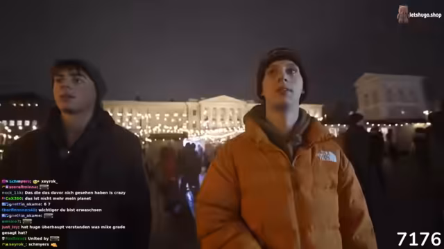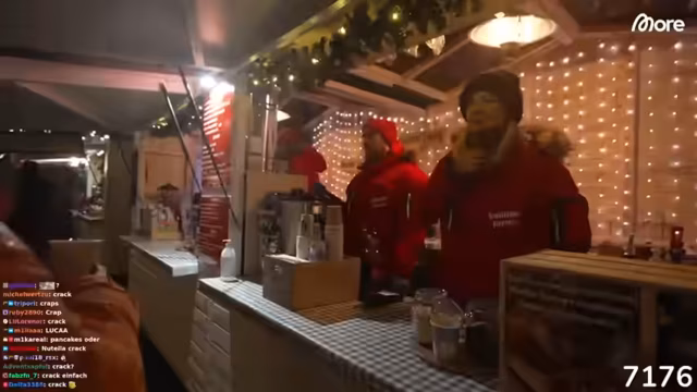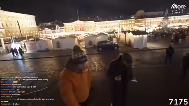 01:12:23Auf dem Weihnachtsmarkt angekommen, sind die Streamer begeistert von der Größe und dem Ambiente. Sie suchen nach einem Crêpe-Stand und überlegen, welche finnischen Spezialitäten es gibt, wobei sie humorvoll über typisch deutsche Speisen wie Bockwurst und Wiener Würstchen diskutieren. Ein Streamer bemerkt, dass sein Handy kein Internet hat, was die geringe Aktivität im Chat erklärt. Sie bewundern die Lichterketten und die allgemeine festliche Stimmung. Es wird auch über die Temperaturen gesprochen, die mit 6-8 Grad Celsius kälter sind als erwartet. Die Gruppe plant, Glühwein zu trinken und die Atmosphäre zu genießen.