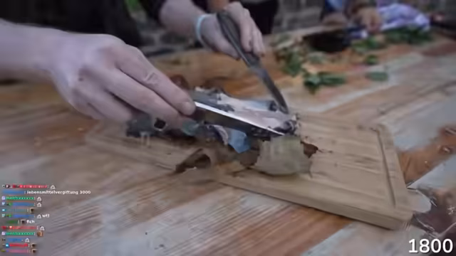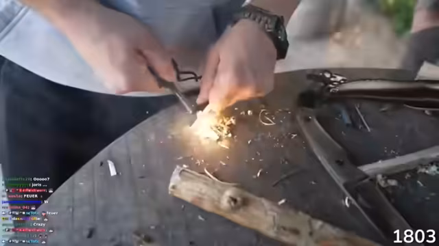 00:37:18Nachdem das Feuer mit modernen Methoden gestartet wurde, wendet sich der Stream der traditionellen Technik des Feuer-Machens mit Feuerstein zu. Der richtige Umgang mit dem Feuerstein und dem Stahl wird demonstriert. Man muss eine scharfe Kante des Steins nutzen, um Späne vom Metall abzuschlagen, und diese Funken auf geeigneten Zunder, wie angekokelten Stoff oder Birkenporling, lenken, um eine Flamme zu erzeugen.