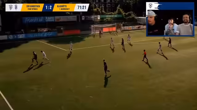 01:45:25Zu Beginn des Streams werden taktische Schwächen der eigenen Mannschaft thematisiert, insbesondere das zu offensive Spiel mit zu vielen Spielern vorne. Es kommt zu einer gelben Karte für einen Spieler des SSV nach einem Zweikampf. Hugo, der zuvor wegen Krämpfen ausgewechselt war, kehrt auf das Feld zurück und übernimmt eine offensive Position. Spieler wie Paul Frege zeigen gute Einzelleistungen, während eine zu unkoordinierte Vorwärtsbewegung kritisiert wird. Die Kommentatoren stellen die These auf, dass bei einem Team mit vielen Influencern das taktische Verständnis manchmal leidet und Laufwege unkoordiniert sind.