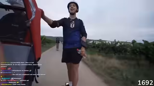 03:03:15Die Live-Longboard-Tour zur Gamescom beginnt mit den ersten Kilometern auf der Moselroute. Der Streamer reflektiert, dass dies eine sehr fahr-intensive Tour ist und mehr eine Männer-Tour als die zuvor unternommene Ösi-Tour. Die Entfernung ist bereits anstrengend und er fragt den Chat nach Meinungen zur Tour und nach Empfehlungen für eine körperlich anstrengende Tour, wobei Hähnchen wegen des Proteingehalts favorisiert wird.