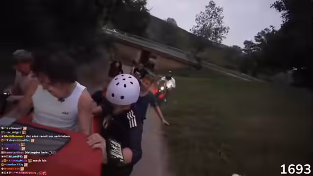 04:16:19Während der Fahrt durch einen Ort kommt es zu einem Zusammenstoß mit einem anderen Teilnehmer. Der Streamer stürzt und verletzt sich an den Knien. Kurz darauf stellt er fest, dass sein Stock, der vorher auf dem Fahrrad befestigt war, verschwunden ist. Ein weiterer Rückschlag, der die Weiterfahrt erschwert und den Zusammenhalt der Gruppe testet.