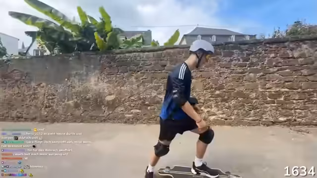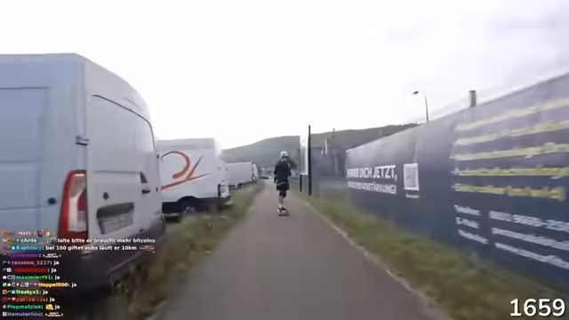 00:22:41Während der Fahrt kommt es zur ersten Interaktion mit einem Zuschauer. Bei einem Halt tauscht der Streamer sein ursprüngliches, unzureichendes Longboard gegen ein besseres Modell des Zuschauers. Der Kaufpreis wird auf 100 Euro festgelegt. Parallel wird die Kameraausrüstung verbessert, indem eine hochwertige Sony FX3-Kamera eingesetzt und der Kamerawinkel zwischen Front- und Rückansicht gewechselt wird, um dem Publikum mehr Abwechslung zu bieten.