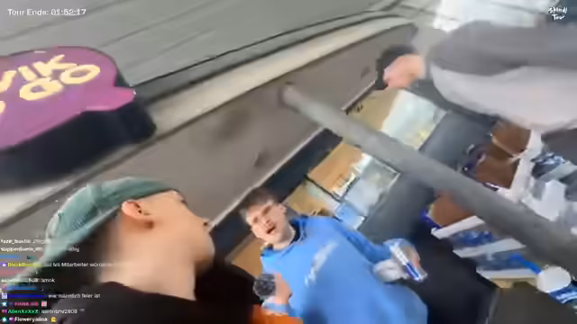 01:12:32Auf der letzten Etappe der Fahrt nach Deutschland wird an einem Raststopp Halt gemacht, um Snacks und Getränke zu kaufen. Der Streamer nutzt die Gelegenheit, um letzte Live-Shots von sich und seiner Umgebung zu machen und auf Zuschauerfragen zu antworten. Dabei werden verschiedene Produkte wie Croissants, Kaffee und Powerade gezeigt und kommentiert. Auch ein kurzer Plausch mit einem Tankwart findet statt, was die entspannte und lockere Atmosphäre in den letzten Minuten des Streams unterstreicht.