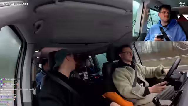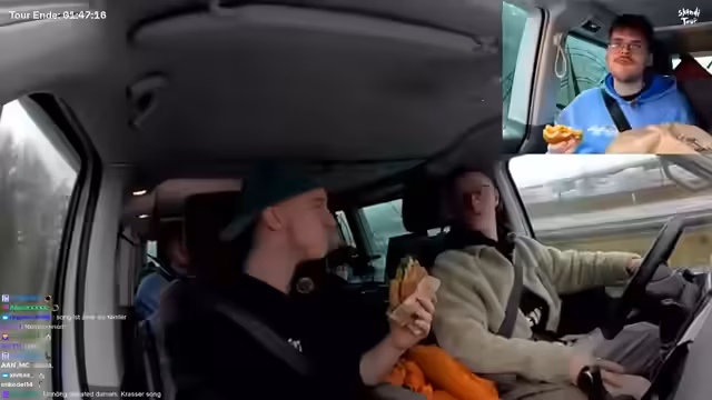 01:31:54Es wird über den Geschmack und die Qualität des Burgers diskutiert, der als nicht besonders gut bewertet wird. Es wird überlegt, ob Marmelade auf dem Chicken-Burger ist. Die Diskussion wechselt zu Erinnerungen an die Schulzeit und einen Mitschüler im Schulbus, der durch sein Verhalten für Unterhaltung sorgte. Es werden Anekdoten über Beleidigungen auf humorvolle Weise erzählt. Es wird über einen Spoiler im Spiel Crafting Attack diskutiert, was zu Verärgerung führt. Die Gruppe überquert die Grenze nach Frankreich, was an den Bäumen erkannt wird. Es wird bemerkt, dass die Polizei hinter ihnen fährt. Die Streamer sprechen über die Bedeutung von Abwechslung im Programm und Heikos mögliche Ausrichtung auf mehr Variety-Content. Die Frage nach der Mental Health wird aufgeworfen und die Lust am Streamen wird diskutiert.