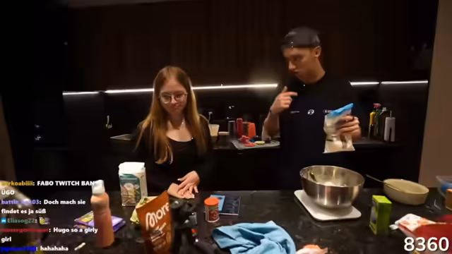 01:47:45Beim Kuchenbacken treten weitere technische Probleme auf, als die Kamera ohne ersichtlichen Grund stummgeschaltet wird. Hugo und Coxic versuchen, das Problem zu beheben, während der Kuchen im Ofen backt. Es wird festgestellt, dass die Butter nicht Raumtemperatur hat, was für den Teig ideal wäre. Hugo schlägt vor, die kurz in der Mikrowelle zu erwärmen. Coxic ist beeindruckt von dieser Idee. Gleichzeitig bemerkt Hugo weiße Pulverreste auf seiner Hand, was zu Spekulationen führt, was es sein könnte. Sie konzentrieren sich jedoch auf den Backprozess und beobachten den Kuchen im Ofen.