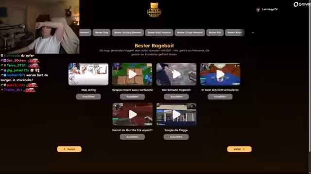 01:40:38Der Streamer leitet über zu den Vivi Awards, bei denen Clips bewertet werden sollen. Er kündigt an, dass die Zuschauer aktiv mitvoten sollen und jede Kategorie durchgehen werden. Das Intro für die YouTube-Zusammenfassung der Vivi Awards wird vorgestellt. Die erste Kategorie ist der „Beste IRL-Moment“, wobei er sofort bemerkt, dass vier der vorgeschlagenen Clips von der „Scandi-Tour“ stammen, was er als problematisch empfindet, da er der Meinung ist, dass es mehr IRL-Momente gab. Der erste Clip, der gezeigt wird, ist ein „harscher“ Moment, der den Streamer überrascht und ihn die Auswahl der Clips hinterfragen lässt. Ein weiterer Clip, „Frau Meier“, wird als Klassiker bezeichnet, wobei er sich wundert, dass dieser Moment noch im selben Jahr stattfand. Die Diskussion über die Clip-Auswahl und die Beteiligung der Community bei der Abstimmung stehen im Vordergrund.