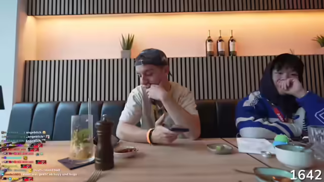 01:48:36Es wird über Kopfschmerzen geklagt und der Wunsch geäußert, zu chillen. Es wird gefragt, ob es im Steakhouse Internet gibt und nach dem Passwort gefragt. Es wird gefragt, ob es alkoholfreien Hugo gibt. Es wird festgestellt, dass der Kellner den Namen kennt und dass dies peinlich ist. Es werden die Preise auf der Karte angesehen und bewertet. Es wird überlegt, welches Steak das Beste ist und festgestellt, dass es auf den Geschmack ankommt. Es wird nach einer Vorspeise gefragt und überlegt, was gegessen werden soll. Es wird nach dem besten Burger gefragt und festgestellt, dass es bessere Wiener Schnitzel gibt. Es wird gefragt, warum nicht das Beste gemacht wird, wenn es bessere gibt. Es wird festgestellt, dass das Steakhouse leer ist. Es wird ein Ribeye bestellt und überlegt, welche Beilage dazu genommen werden soll. Es werden die besten Pommes und eine gesunde Beilage ausgewählt. Es wird eine Soße für das Steak ausgewählt. Es wird überlegt, welches Dessert genommen werden soll und festgestellt, dass der Lavacake der Beste sein soll. Es wird der Hugo bewertet und festgestellt, dass er nicht süß genug ist. Es wird beschlossen, dass der Hugo süßer gemacht wird. Es wird das Rumsteak bestellt. Es wird gesagt, dass jemand immer zum Lachen gebracht wird und dass jemand von seinen Eltern geschlagen wird. Es wird geraten, mit jemandem darüber zu reden. Es wird festgestellt, dass das Licht nicht ausgemacht werden kann und dass die Pflanze nicht echt ist.