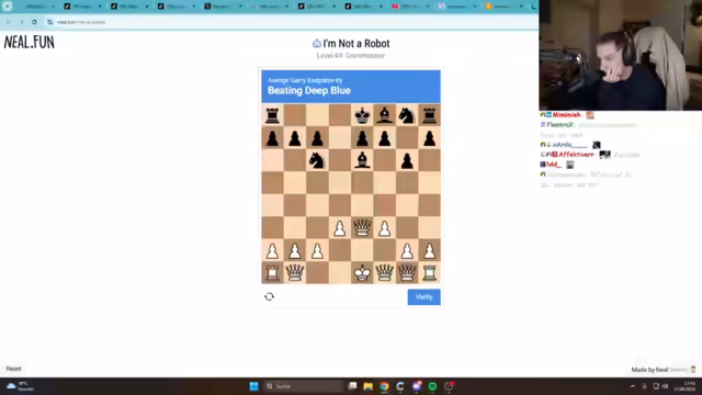 01:59:37Zunächst wird ein Schachspiel kommentiert, wobei verschiedene Züge und Strategien besprochen werden. Es geht um Bauern, Damen und Türme, und die Bedeutung von Schachmatt wird erklärt. Nach dem Spiel folgt ein humorvoller Übergang zu anderen Themen, inklusive eines gespielten Beziehungsstreits. Anschließend wird eine Captcha-Aufgabe thematisiert, bei der es darum geht, Felder eines Stockwerks im Empire State Building auszuwählen, was zu Frustration und Belustigung führt. Nach anfänglichen Schwierigkeiten und der Nutzung von Hilfsmitteln wird die Aufgabe schließlich gelöst. Der Streamer zeigt sich erleichtert und amüsiert über die überstandene Herausforderung.