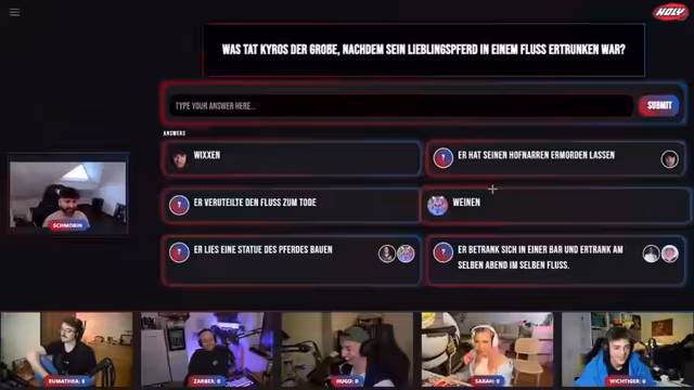 02:26:14Die erste Frage lautet: "Was tat Kyros der Große, nachdem sein Lieblingspferd in einem Fluss ertrunken war?" Die Teilnehmer reichen ihre Antworten ein, wobei eine von Hugo "Wichsen" lautet. Die abgegebenen Antworten werden erst nach der Enthüllung für alle sichtbar. Die korrekte Antwort ist unter die anderen gemischt. Nach der Abstimmung werden die Ergebnisse präsentiert: Zwei Stimmen für eine Pferdestatue, zwei für Ertrinken im Fluss, eine für die Ermordung des Hofnarren und Hugos Antwort "Wichsen". Die korrekte Antwort war jedoch, dass er den Fluss zum Tode verurteilte. Die Punkte werden verteilt, wobei Zabex und Romata vier Punkte erhalten und Wichtiger zwei. Es wird angemerkt, dass in Zukunft keine Punkte am Ende der Antwort stehen sollten.
