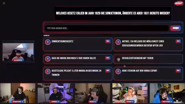 02:30:25Die nächste Frage thematisiert ein Gesetz der Sowjetunion aus dem Jahr 1929, das 1931 bereits wieder geändert wurde. Es folgt eine Diskussion über das Niveau der Fragen, wobei angemerkt wird, dass die richtigen Antworten oft auf Hochdeutsch formuliert sind. Die Teilnehmer reichen ihre Antworten ein, darunter Artikel 13a, die Einführung einer Fünftagewoche, Geschlechtsverkehr mit Tieren, die gesetzliche Pflicht, drei Liter Wodka pro Woche zu trinken, und hohe Steuern auf den Wodka-Export. Es entsteht eine Diskussion über die korrekte Schreibweise von "Wodka", wobei Unsicherheiten aufkommen. Die richtige Antwort ist, dass die Woche nur noch fünf Tage haben sollte. Hugo erhält erneut eine humorvolle Erwähnung für seine Antwort. Wichtiger wird für sein Wissen gelobt, während Romatra und er dieselbe Idee hatten, aber Romatra sie besser umsetzte. Ein Teilnehmer entschuldigt sich für einen Rechtschreibfehler und macht einen politischen Witz.