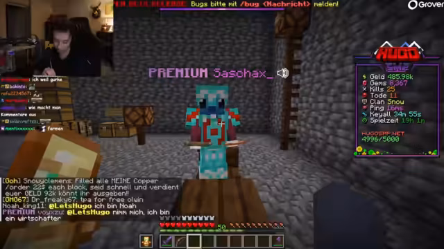 00:05:00Der Streamer beginnt mit Begrüßung und berichtet von einer Erkältung, bei der Halsschmerzen zwar verschwunden sind, aber starke Kopfschmerzen und verstopfte Nase hinzugekommen sind. Er interagiert intensiv mit dem Chat, nennt zahlreiche Namen von Zuschauern (z.B. Pipo, Paul, Lady, Icky May) und erwähnt humorvoll die Bitte um PayPal-Spenden. Anschließend diskutiert er technische Probleme auf Hugo-SMP, wie eine mögliche Queue bei vollen Slots, und reagiert auf eine Chat-Anfrage, den neuen Server-Kurs zu prüfen.