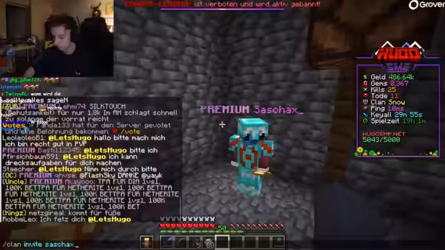 01:40:29Nach technischen Schwierigkeiten mit dem Casino-Bot wechselt der Streamer sein Fokus auf die Gründung seines eigenen Clans namens 'Snowclan'. Er beginnt aktiv neue Mitglieder zu rekrutieren und erklärt die Kriterien für eine Aufnahme. Entscheidend sind nicht nur PvP-Fähigkeiten, sondern vor allem eine gelungene Bewerbung und ein positives, chilliges Auftreten. Er organisiert verschiedene Herausforderungen wie MLG-Sprünge, Bogenzielübungen, Parcours und 1-gegen-1-Duelle, um die Fähigkeiten und den Charakter der Bewerber zu testen.