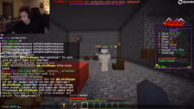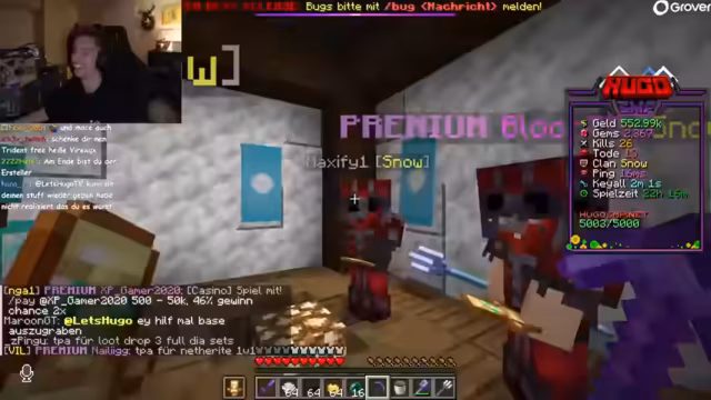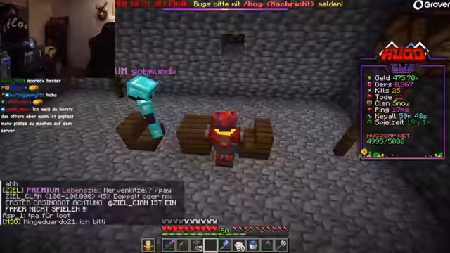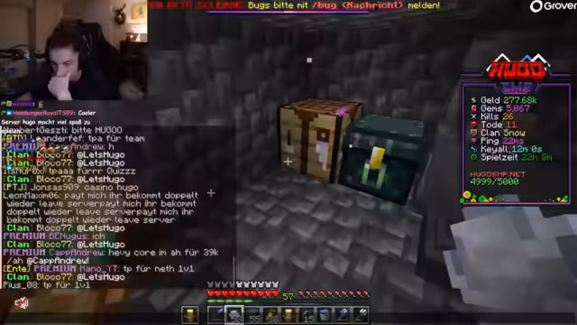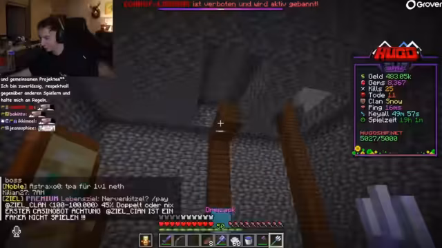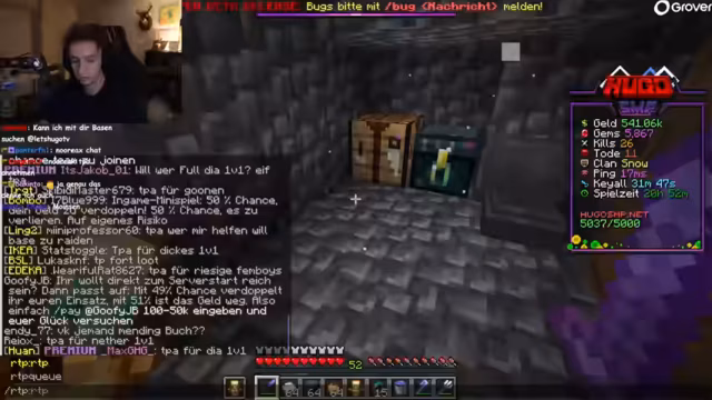 01:37:30Hugo erklärt Overleben-Strategien auf dem Server: Slash-RTP für Zufallsspawns, Werteinblick via /worth, Handel über /ah und Bestellsysteme (/orders). Er warnt vor Base-Raids durch Angriffe auf Ores, Tuff-Adern oder Koordinaten (Chords). Empfohlen werden versteckte Bases ohne Enderchests, Schilder oder Enchanting Tables – besonders während der ersten 15-Sekunden-Combat-Lockphase nach dem Spawn.