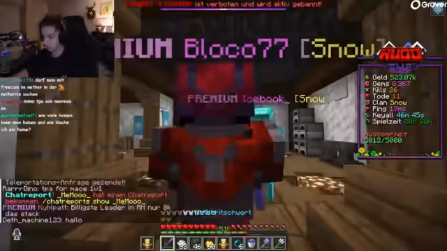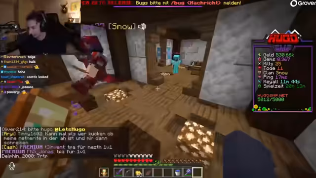 01:09:07Nach dem Jahresrückblick wechselte Hugo ins Spiel Minecraft auf seinem HugoSMP. Der Server war aufgrund seiner Beliebtheit sofort wieder überfüllt. Hugo startete eine Kooperation mit dem DFB, um geeignete Spieler für eine virtuelle Musterung zu finden. Parallel dazu begann er mit dem systematischen Aufbau seines neuen 'Snow-Clans'. Er kündigte an, Mitglieder über ein Bewerbungssystem mit Parcours-Tests aufzunehmen, um eine schlagkräftige Gemeinschaft aufzubauen und effektiver gegen Konkurrenzclans vorgehen zu können.