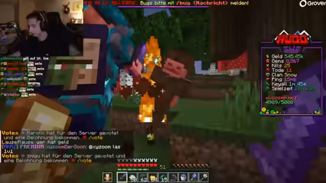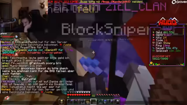 05:03:47Hugo trifft zufällig auf einen anderen Spieler (Ugo) und es kommt zu unerwarteten PvP-Kämpfen. Es entstehen chaotische Gefechte mit mehreren Beteiligten, bei denen Hugo mehrfach stirbt und mit Totems kämpft. Die Begegnung führt zu Diskussionen über Server-Balance, Fairness und die Anzahl der beteiligter Spieler. Hugo bemerkt die ungewöhnliche Spielerdichte und die Herausforderungen, die daraus resultieren.