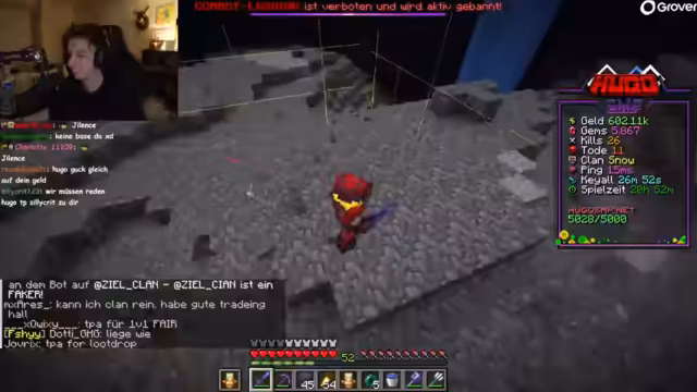 02:46:34Der Clan sucht weiter nach Mitgliedern, um auf sieben zu kommen. Mehrere Bewerbungen werden geprüft, darunter "Keiner Homeless" und "Maniac", aber es gibt technische Probleme mit dem Chat und TPA-Anfragen. Sascha Nivan (19) bewirbt sich: Er hat 220 Geld, 15 Stunden Spielzeit und farmt "Aura". Im PvP-Test zeigt er schwache Leistung, ebenso im Jump'n'Run und Bogenschießen. Trotz schlechter Noten wird er aufgenommen, da er für "Drecksaufgaben" bereit ist. Clan-Mitgliederzahl steigt auf vier.