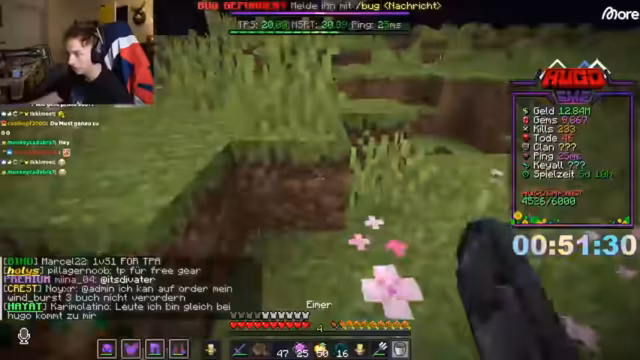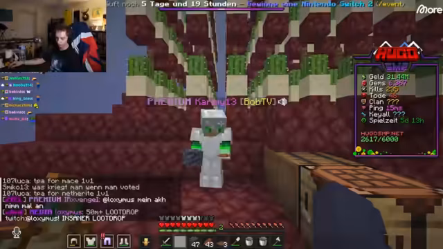 03:08:33Der Stream beginnt mit einer Challenge, bei der Hugo 100 Euro an denjenigen auslobt, der ihn tötet. Er erwägt, einen zufälligen Spieler auszuwählen, der nicht teleportieren darf, um es fair zu gestalten. Nachdem er einen Spieler namens Lennart ausgewählt hat, stürzt er sofort in einen Kampf und erleidet schnellen Schaden, wobei er in Lava fällt und stirbt. Hugo ist verärgert und glaubt, dass seine Ausrüstung durch Trolle mit Clear Lava manipuliert wurde. Er fordert eine Überprüfung der Logs, um alle beteiligten Spieler für einen Monat zu bannen.