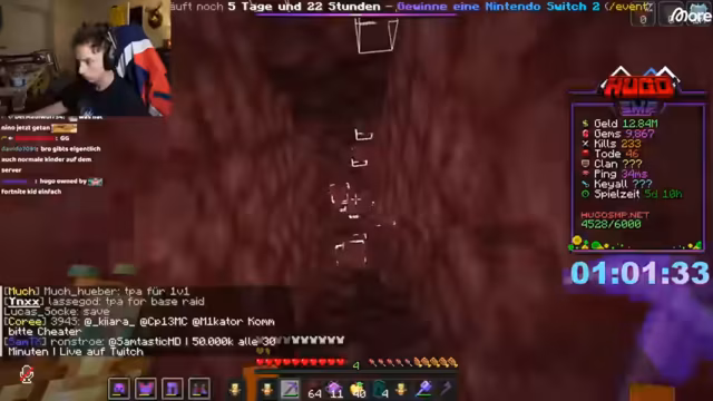 05:55:35Hugo und sein neuer Freund Kabi versuchen gemeinsam, eine Höhle zu finden, haben aber damit wenig Erfolg. Der Server leidet unter Performanceproblemen und hängt, was Hugo dazu bewegt, den Entwickler Raphael im MyGift-Chat zu kontaktieren und auf den hohen Lag (TPS) aufmerksam zu machen. Kabi, der seit kurzem Premium hat, und Hugo finden zwar Diamanten und Gold, aber das unruhige Gameplay stört den Spielverlauf.