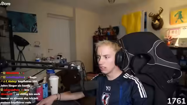 01:12:34Ein tiefgründiges Gesprächsthema ist eine Umfrage, die der Streamer in seiner WhatsApp-Gruppe gestellt hat: "Hatten mehr Menschen in der Menschheitsgeschichte Kontakt mit Kopfhörern oder mit Handys?". Die meisten haben sich für Handys entschieden, doch der Streamer argumentiert, dass historisch betrachtet, durch ältere Generationen und die Nutzung von iPads, mehr Menschen mit Kopfhörern in Kontakt kamen. Dies führt zu einer hitzigen Diskussion im Chat über die Definition von "Kontakt" und die Verfügbarkeit der Geräte im Laufe der Geschichte.