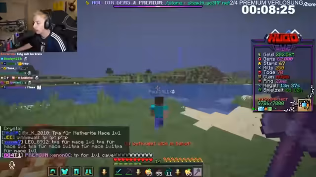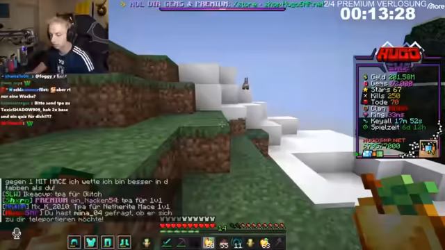03:10:25Der Streamer wechselt das Spiel und betritt seinen Minecraft-Server 'Hugo SMP'. Er interagiert mit anderen Spielern wie 'Togo' und 'Rewey', besucht deren Bases und plant Aktivitäten wie 1-vs-1-Duelle mit der Waffe 'Mace'. Es gibt Diskussionen über die Qualität der Bases und eine private Abmachung zwischen dem Streamer und einem anderen Spieler, der eine Woche lang auf dem Server gebaut hat. Streamer erwähnt auch eine Woche ohne Internet und hat danach wieder Zugriff auf den Server.