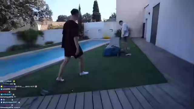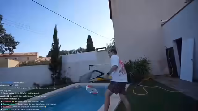 00:49:53Am Poolrand entsteht eine Diskussion über die Möglichkeit, vom Dach in den Pool zu springen. Ein Streamer ist begeistert von der Idee und spricht von ausreichend Momentum und Mut. Die anderen sind skeptisch und äußern massive Sicherheitsbedenken aufgrund der Weite und Tiefe des Sprungs. Es wird ein Vorschlag gemacht, ein Sicherheitsnetz zu spannen und eine Matte aufzustellen, um das Risiko zu minimieren, was aber letztlich nicht umgesetzt wird. Die anfängliche Abenteuerlust weicht der gemeinsamen Einsicht, dass der Sprung zu gefährlich ist.