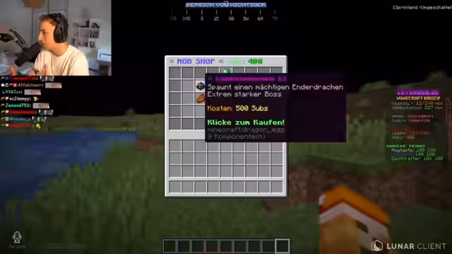 04:19:53Es wird das Wirtschaftssystem des Minecraft-Kriegs erklärt. Durch Abonnements auf den Stream erhalten die Spieler 'Subs', die als Währung innerhalb des Spiels fungieren. Mit diesen Subs können sie im Spiel-Shop Items kaufen, um ihre Verteidigung im Clash zu stärken. Dazu gehören unter anderem Ender Drachen Eier, Eisengolem Eier, Zombies und Skelette. Ziel ist es, mit diesen strategisch erworbenen Vorteilen den eigenen Netherite Block erfolgreich zu verteidigen und als am Ende mit den meisten Lebenspunkten zu gewinnen.