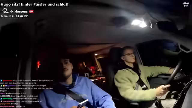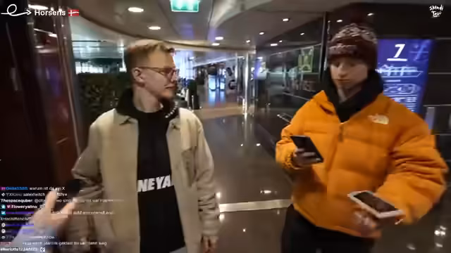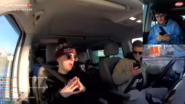 00:54:47Es wird sich vergewissert, dass man sich auf dem richtigen Weg zur Fjordline befindet. Ein Mitarbeiter der Fährgesellschaft überprüft die Ausweise, wobei Hugos luxemburgische Nationalität für Erheiterung sorgt. Hugo gibt eine improvisierte luxemburgische Tirade gegen die Corona-Maßnahmen zum Besten. Es wird bezweifelt, dass das Internet auf der Fähre funktionieren wird, da diese keine Seitendinger hat. Es wird diskutiert, ob eine Drohne geflogen werden soll. Es wird sich darüber lustig gemacht, dass Heiko den Bus nicht mehr fahren darf. Es wird im Chat gefragt, ob mit der Drohne am Hafen rumgeflogen werden darf. Es wird sich gefragt, was im Chat gefragt werden soll.