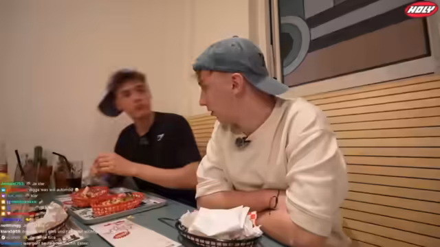 07:46:19Der Streamer und sein Begleiter besuchen ein Burgerladen namens 'The Goat', das sich als sehr beliebt herausstellt. Nachdem sie einen Sitzplatz gefunden haben, beginnen sie mit der Bestellung. Ein wichtiges Element des Streams ist ein Interaktion mit dem Chat, in der der Streamer versucht, das Gericht seines Begleiters Hugo zu erraten. Dabei kommt es zu einem humorvollen Wettkampf, bei dem Hugo den 'Goat Burger' und der Streamer den 'Gold Burger' bestellt. Die Bestellprozess wird begleitet von der Unterhaltung und den Reaktionen der beiden auf die Speisekarte.
