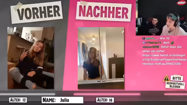 01:26:58Enya (13 vs. 30) erfährt ein 'krankes Glow-Up', das den Streamer 'White-Screen'-Techniken vermuten lässt. Bei Lea wird das Bild vom Streamer fälschlicherweise für 16 gehalten, obwohl sie 20 ist, was zu einer Diskussion über Alter und Aussehen führt. Bei Liliana (12 vs. 15) wird der Style-Wechsel als entscheidender Faktor für den Glow-Up identifiziert.