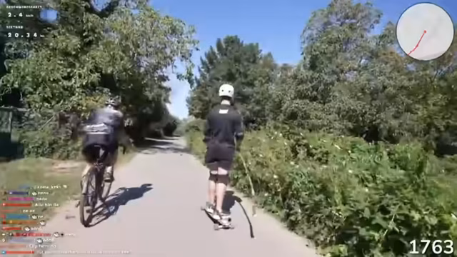 02:15:50Die Streamer erreichen eine Stelle, auf der sie sich auf einem Fahrradweg fortbewegen können, der als besser als die vorherige Straße beschrieben wird. Sie erreichen Geschwindigkeiten von etwa 14-16 km/h und erleben einen adrenalinstreichen Moment, als ein Zug kommt. Die Körperschmerzen werden intensiver, aber sie motivieren sich gegenseitig weiterzufahren.