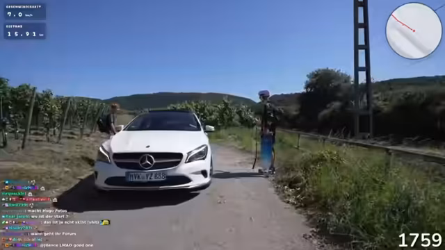 02:02:44Die Streamer diskutieren über verschiedene Transportmöglichkeiten für die weitere Strecke, darunter ein E-Scooter, der sie bis zu 60 km/h schnell ziehen könnte. Allerdings wäre dies gefährlich bei Unebenheiten. Sie entscheiden sich, einen Teil der Strecke zurückzulegen, da der direkte Weg nicht befahrbar scheint. Die Route führt sie nun über den Rheinweg durch Weinberge nach Koblenz.
