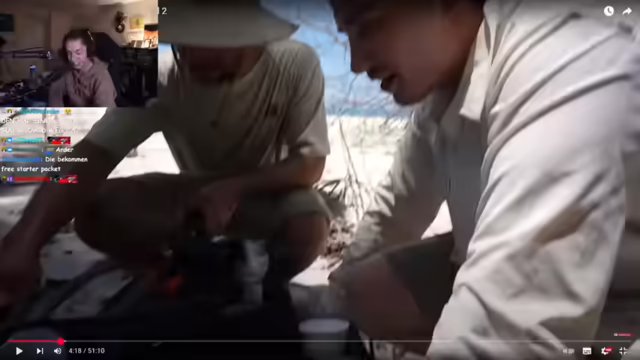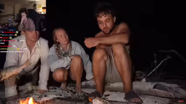 01:22:00Elias fängt einen Fisch, was als großer Erfolg gefeiert wird. Heiko erklärt Allgemeinwissen über Fische. Bevor der Fisch zubereitet wird, soll die Bank fertiggestellt werden. Die TikTok-Bewerbungen werden als enttäuschend empfunden, da viele Bewerber die Aufgabenstellung nicht richtig umgesetzt haben. Die Gruppe baut eine Bank und macht ein Feuer. Es werden Kokosnüsse als Brennmaterial verwendet. Der gefangene Fisch wird gegrillt und gemeinsam gegessen. Der Streamer gesteht, alle Schokoriegel gegessen zu haben, was für Unmut sorgt. Es wird diskutiert, ob der Fisch den Verlust der Riegel ausgleichen kann.