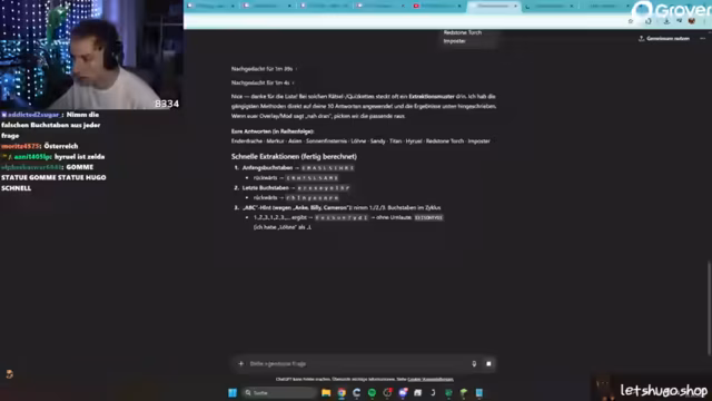 02:31:14Das Stream-Team sucht intensiv nach einem entscheidenden Hinweis, der auf einer seltsamen Webseite mit der Adresse „Schlangen-Game.de“ versteckt ist. Der Streamer versucht, mit den Zuschauern zusammenzuarbeiten, um eine Rätsel-Seite zu lösen, die mehrere Eingabefelder und seltsame Symbole enthält. Es gibt Verwirrung über die richtige Vorgehensweise, und es werden Theorien besprochen, dass möglicherweise ein Code mit der Zahl 17 gesucht wird, die sich aus 9 minus 1 ergibt. Die Zuschauer helfen, indem sie Links in den Discord posten und gemeinsam nach Lösungen forschen.