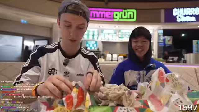 02:22:41Es beginnt mit einer Diskussion über die Essgewohnheiten beim Döner, insbesondere die Soßenvielfalt in Luxemburg im Vergleich zu anderen Städten. Ein lokaler Dönerladen namens 'Honest Kebab' wird erwähnt, zusammen mit einem Besuch beim 'Gangnam-Asiaten'. Der Versuch, bei 'Honest Kebab' zu essen, scheitert jedoch an einer zu langen Schlange und schließlich daran, dass der Laden ausverkauft ist. Es wird versucht, über Dominik und Maywee Kontakt zu Holle aufzunehmen, um möglicherweise doch noch einen Döner zu bekommen. Währenddessen werden Chat-Grüße ausgerichtet und humorvolle Kommentare an die Zuschauer verteilt. Der Fokus verschiebt sich auf die Suche nach einer Alternative zum Döner, wobei gesunde Optionen wie Smoothies und Wraps bei 'Immergrün' in Betracht gezogen werden. Letztendlich entscheidet man sich für 'Immergrün', wo Teriyaki-Chicken und Mexikan-Beef Wraps sowie Erdbeer-Wunder Smoothies bestellt werden. Es folgt eine Diskussion über die hohen Preise und die Frage, ob es sich um eine gesunde Mahlzeit handelt.