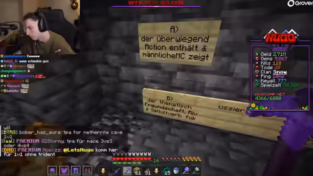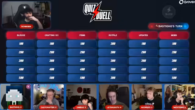 03:29:17Das Schmobbin-Quiz beginnt mit interaktiven Fragen an den Chat. Der Streamer moderiert das Quiz und lädt Teilnehmer ein, durch Tippen von Antworten mitzuwirken. Es werden verschiedene Themen behandelt, darunter Minecraft-Wissen und persönliche Fragen. Punkte werden für korrekte Lösungen vergeben, während technische Herausforderungen mit der Kommunikation auftauchen und Diskussionen über die beste Plattform auslösen.