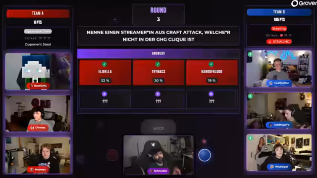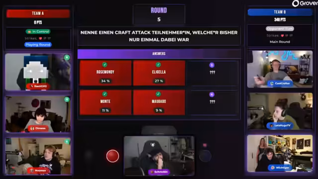 05:26:57Die Gruppe beantwortet eine Frage, die einen Craft Attack-Teilnehmer oder eine Teilnehmerin nennt, die nicht in der GAG-Clique ist. Sie debattieren über mögliche Kandidaten wie 'Rose', 'Trimax', 'Monte', 'Hand of Blood' und andere. Es wird festgestellt, dass viele große Namen bereits bekannt sind, daher suchen sie nach jemandem, der 'nur einmal dabei war'. Die Diskussion dreht sich um Personen wie 'Zabex', 'Paluten', 'Chef Strobl', 'Artemis' und 'Alphastein'. Letztlich wird 'Paul Frege' als möglicher neuer Call genannt, der in der Bubble präsent ist, aber nicht zu den bekannten 'Big Five' gehört.