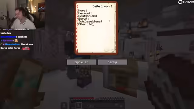 01:32:59Die Gruppe bereitet eine kurdische Pferdehochzeit in Minecraft vor, bei der der Streamer die Rolle des Priesters übernehmen soll. Rose gibt ihm Anweisungen und Details zur Hintergrundgeschichte des Brautpaares. Horst, ein 67-jähriger Schlüsseldienstmitarbeiter aus Deutschland, soll Tiramisu heiraten, eine 27-jährige Astronautin aus Frankreich, die ursprünglich aus dem 14. Jahrhundert stammt und eine tragische Vergangenheit mit einem im Krieg verschollenen König namens Amadeus Ferdinand Maria von Savoyen hat. Der Streamer muss sich einen Priester-Skin besorgen und die Zeremonie leiten. Es wird besprochen, wie die Pferde hereingeführt werden und welche Musik gespielt werden soll, um die Hochzeit feierlich zu gestalten. Trotz einiger chaotischer Momente und Verwechslungen bleibt die Gruppe bei den Hochzeitsvorbereitungen.