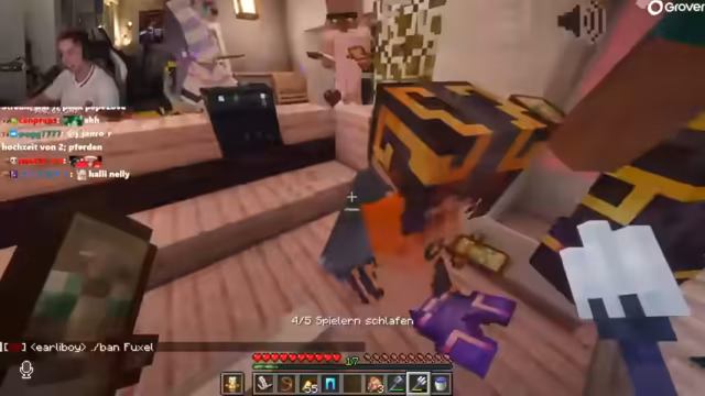 02:29:00Nach dem turbulenten Ende der Hochzeit eskaliert die Situation, als Charaktere sich bekämpfen und gegenseitig attackieren. Der Streamer wechselt den Skin, um die Verwirrung zu verstärken. Der Fokus verlagert sich auf eine PvP-Aktion, bei der der Streamer mit Enderperlen gegen Gegner kämpft und versucht, sie ins Void zu stoßen. Er experimentiert mit der optimalen Flugbahn und schafft es am Ende, einen Gegner ins Void zu befördern.