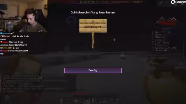 01:51:14Nach einer Pause kehrt der Streamer auf einen Minecraft-Server zurück. Er kritisiert die geringe Server-Sichtweite und berichtet über technische Mechaniken. Es wird erklärt, dass die Server-Sichtweite absichtlich niedrig ist, um Duplication-Bugs aufzudecken. Spieler können sich gegenseitig mit einem speziellen Befehl (EVC) Inventare ansehen, was zur Entdeckung mehrerer Duplication-Methoden führt. Stream-Ziel ist der Sieg über den Enderdrachen.