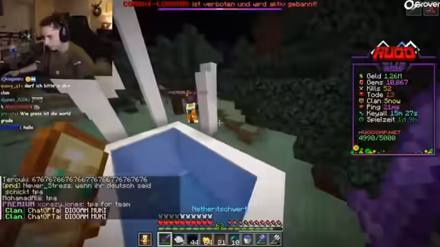 03:59:15Der Streamer entdeckt eine befreundete Base, die überfallen wurde, und reagiert wütend auf die Angreifer. Er diskutiert mit seinem Clan über Verluste, fehlende Ressourcen wie Netherite und strategische Fehler. Es kommt zu Diskussionen über Wiederaufbau und Ressourcenmanagement. Ein Mitglied namens Hugo wird beschuldigt, die Base verraten zu haben, was zu Vorwürfen und Versuchen führt, ihn zu bestrafen. Die Szene zeigt die Dynamik von Clan-Konflikten und die Herausforderungen des Teamspiels auf dem Server.