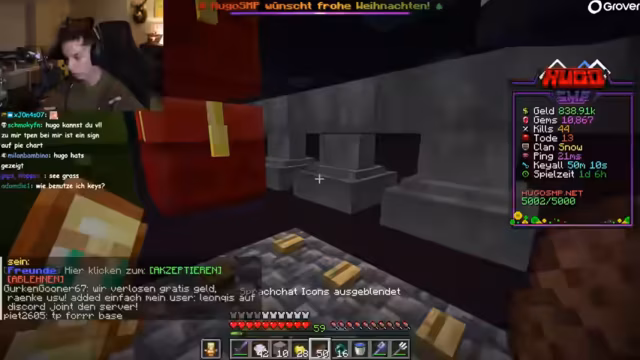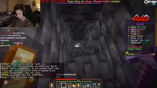 05:40:12Die Stimmung schlägt um in Gefahr, da gegnerische Spieler die Basis angreifen. Der Streamer und seine Gruppe planen die Verteidigung und bauen einen Bunker. Es kommt zu Angriffen, bei denen Gegner versuchen, mit TPA-Anfragen und Waffengewalt einzudringen. Die Gruppe muss schnell reagieren, um sich zu schützen und wertvolle Gegenstände zu retten.
