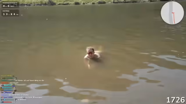 03:14:56Nach einer anstrengenden Bergfahrt erreicht die Gruppe die Mosel. Es wird eine Pause eingelegt, und ein Schwimmen in der Fluss wird erwogen. Der Streamer diskutiert mit dem Chat über Hygiene, mögliche Verschmutzungen und die Anwesenheit von Tieren im Wasser. Kurz darauf springt er ins Wasser, was zu einem inszenierten, aber wild wirkenden Bad führt. Danach beschließt er, die nasse Unterhose weiterzutragen, um schneller zu trocknen, und fährt so weiter.