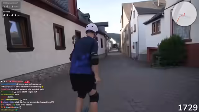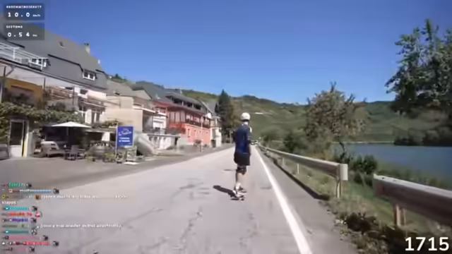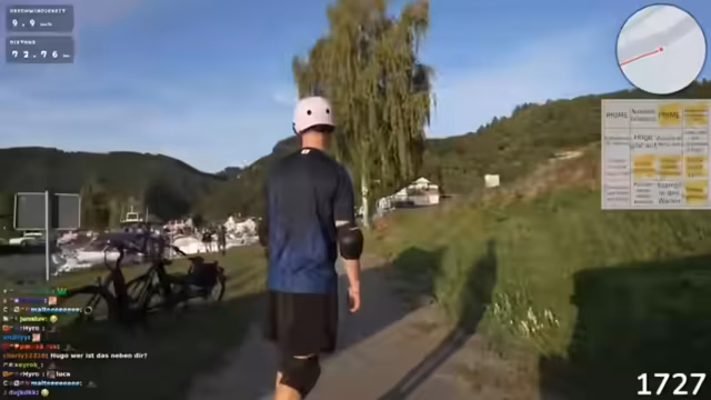 05:16:05Nach 15 Kilometern mit dem Longboard ohne Unterstützung des Akkus wird das Tagesziel Koblenz für den nächsten Tag definiert. Der Streamer gibt bekannt, dass ab sofort wieder Akku zur Verfügung steht, was die Erreichbarkeit des Ziels sichern soll. Die Planung für die restliche Strecke nach Köln, die noch 100 Kilometer beträgt, wird angesprochen.