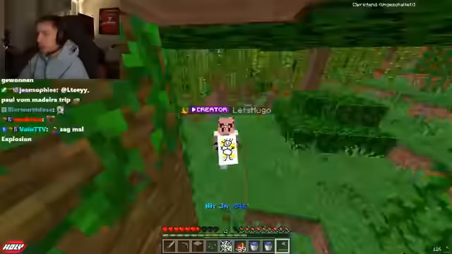 02:47:24Ein Streamer landet unkontrolliert in der Luft und erhält den Status 'Fallschaden-Immunität'. Die einzige Möglichkeit, diesen Effekt zu entfernen, ist das ständige Sagen des Wortes 'Wasser'. Dies führt zu einer völligen Fixierung auf dieses Wort, um sicher zu landen. Die Session endet in einem Zustand völliger Kommunikation und chaotischer Handlung, in dem die Streamer versuchen, sich gegenseitig mit Wasser und anderen Notfallwörtern zu helfen.