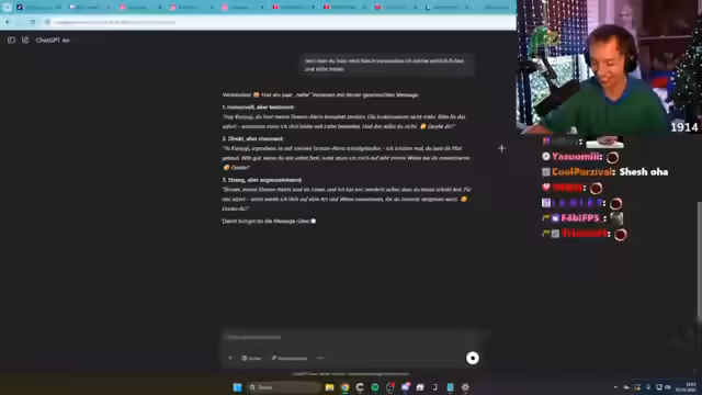 01:45:30Hugo erkundet innovative und humorvolle Anwendungsmöglichkeiten für KI. Er entwickelt die Idee, eine speziell trainierte KI als „Bot-Donation“-System zu nutzen, die passend zur Streamsituation lustige Spenden generiert. Gleichzeitig frustriert ihn die KI, wenn sie Fakten falsch darstellt, was sein Vertrauen in die Allwissenheit der KI untergräbt. Es wird deutlich, dass Hugo die KI sowohl als ein kreatives Werkzeug für die Zukunft seines Streams sieht als auch als eine Konkurrenz, die die Fähigkeit zur selbstständigen Problemlösung beim Menschen verringern könnte.